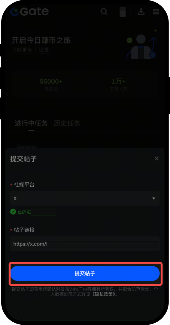 发布完成后,将您的发布链接提交。点击“提交贴文”按钮,为了防止您的推广帖被他人盗用,参与发帖任务时,请先根据提示完成社媒绑定。然后将发布本次宣发内容链接粘贴到提交框中,点击提交即可。